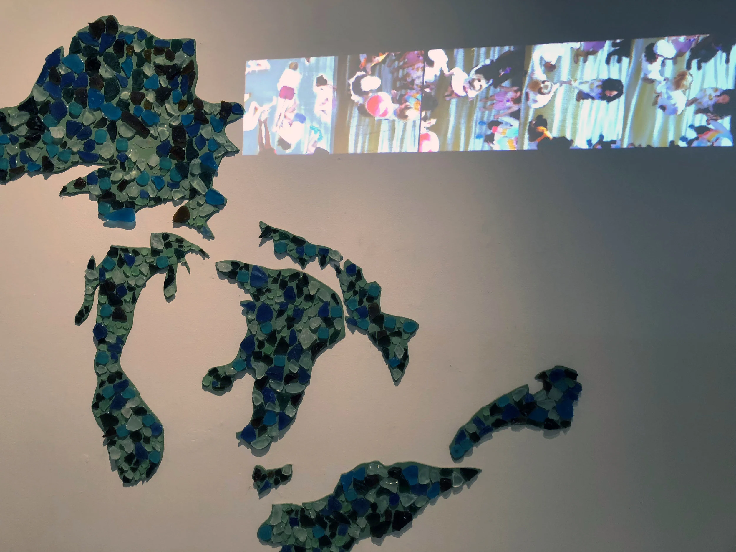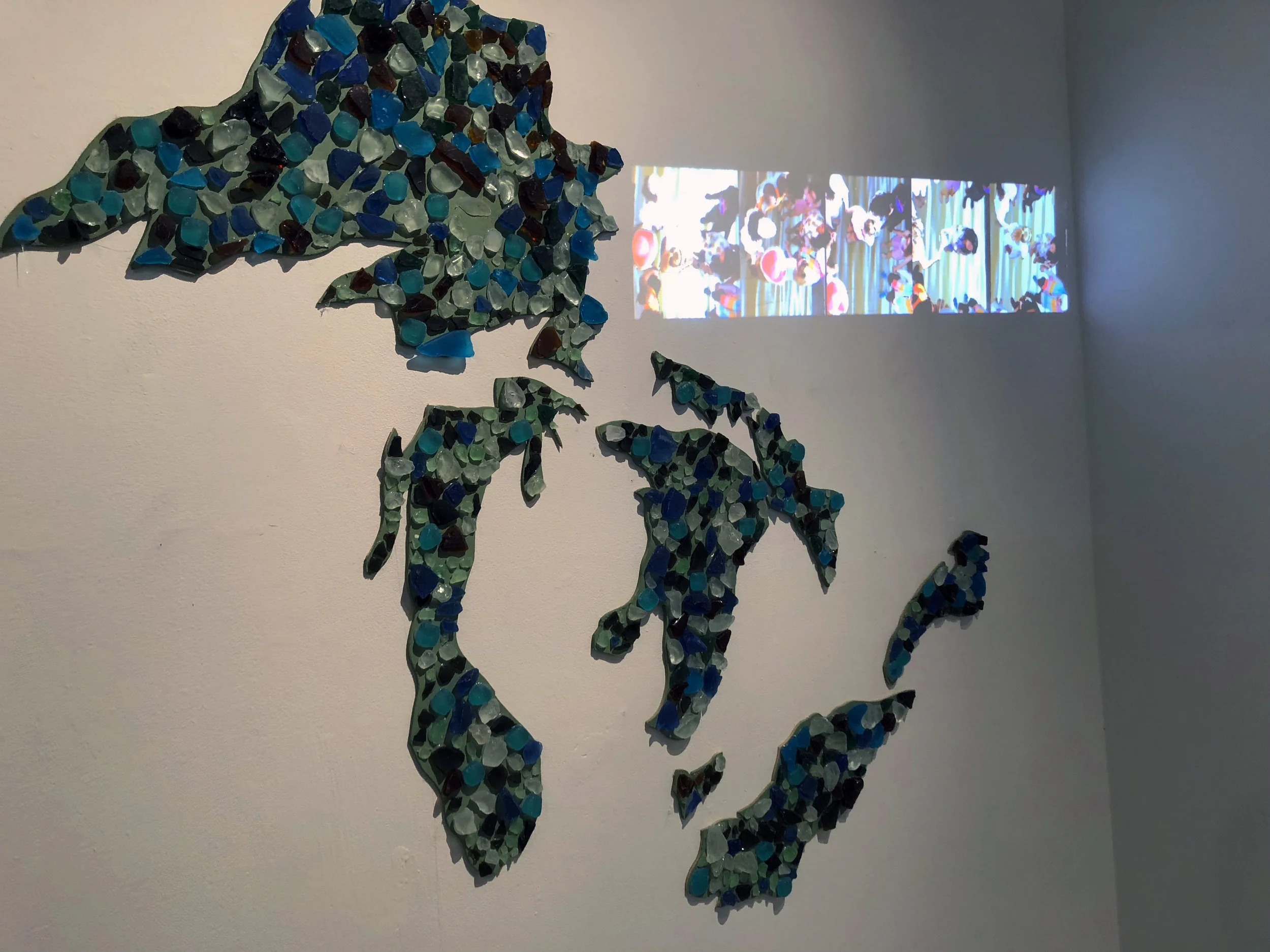 Summers spent on the lakes are synonymous with the feeling of the breeze hitting your face, sandy feet, and hunting for sea glass early in the morning. Sea glass covers the shorelines of the Great Lakes, as it covers the installation portion of my piece. The beach-goers in the video spell out the acronym: HOMES. It stands for Huron, Ontario, Michigan, Erie, and Superior, the five great lakes.